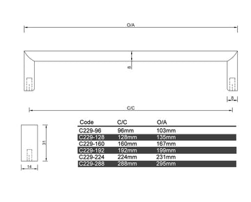 The C229 - Inverell Cabinet Handle features a square contemporary design, with a smooth and sleek appearance that makes it a great choice for modern kitchens and bathrooms. The handle has a rounded shape, with a curved profile that fits comfortably in the hand, providing a comfortable grip when opening and closing cabinets and drawers. This stylish cabinet handle is perfect for anyone looking to update the hardware.