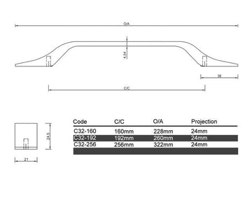 The C32 Hamilton Cabinet Handle features a flat top design that adds a touch of architectural elegance to kitchens, laundries, or bathrooms. These handles are the perfect choice to infuse your space with a refined and sophisticated look, creating a seamless blend of style and functionality.